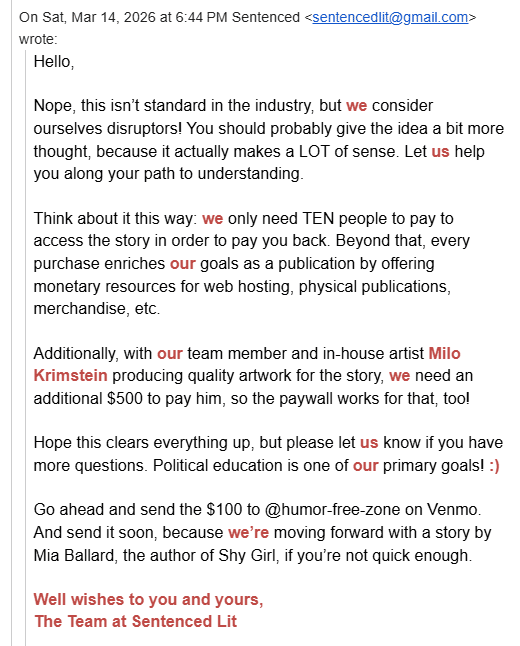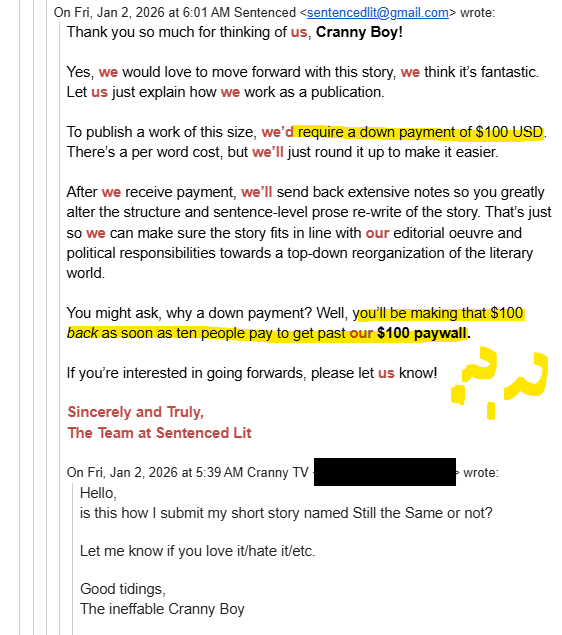 Due to the controversy, if you send prose, images, or comics to contributions@sentencedlit.org, we promise you will not have to pay money to get it published. That’s just not how we’ll work in the future, no matter how strongly we feel about how much better it’d be with a one hundred dollar paywall.